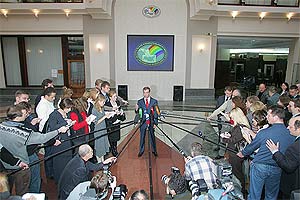 На фото ИТАР-ТАСС: Пресс-конференция кандидата в президенты Д.А.Медведева в Центризбиркоме после подачи документов, связанных с его выдвижением. Телеканалы этот сюжет показывали в 11 раз больше, чем аналогичные информповоды, связанные с Г.А.Зюгановым и В.В.Жириновским. По версии ЦИК РФ - это было не предвыборное мероприятие, а значит требования Закона «О выборах президента» на это избирательное действие не распространяются.