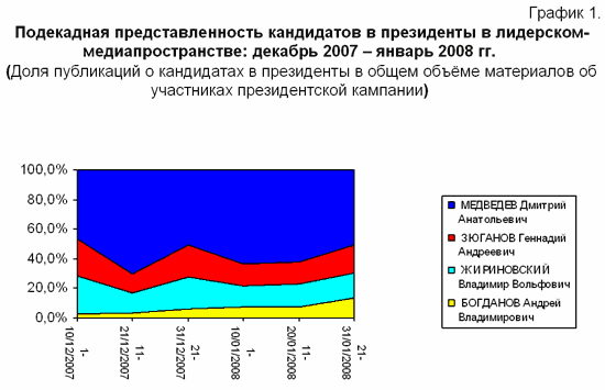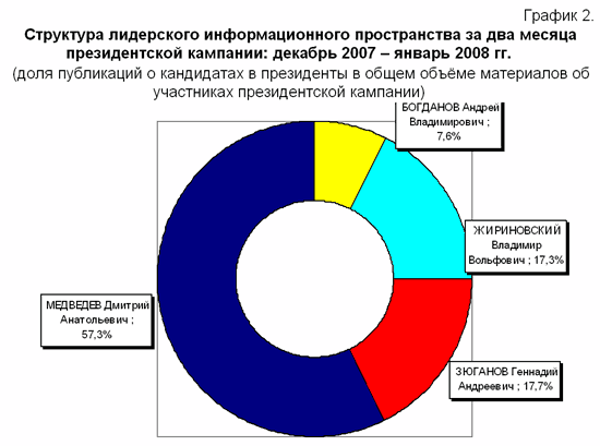 В январе в лидерском информационном пространстве уверенно первенствовал кандидат «Единой России» Д.А.Медведев. Его представленность в СМИ в первый месяц 2008 года была 55,3% от общего объема публикаций с упоминанием кандидатов в президенты. Это несколько меньше, чем в декабре (59,2). Несмотря на то, что доминирование Д.А.Медведева на ТВ было тотальным – в печатных и интернет-СМИ его преимущество оказалось не столь значительным.