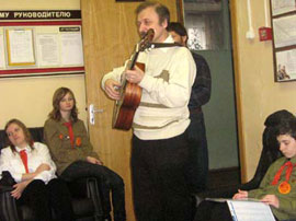 В уютной и по-домашнему теплой обстановке продолжилось мероприятие в самой 208-й школе. Открыл праздник восьмиклассник Василий Фунтиков собственным исполнением на фортепьяно гимна нашей страны. Десятки пионеров, молодежи и ветеранов, затаив дыхание, гордо стояли во время его исполнения. Праздничный концерт продолжили известные барды - лауреаты конкурса "Песни сопротивления" Анатолий Беляев и Николай Прилепский, которые вызвали восторг у ветеранов за смелые песни о нашей армии.
