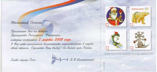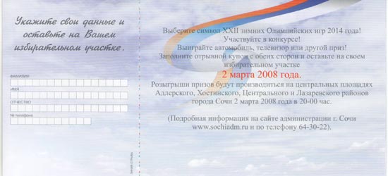 В период предвыборной агитации на территории города Сочи распространяется листовка с отрывным талоном, на одной стороне которой помещено приглашение на выборы Президента Российской Федерации, на другой – приглашение к участию в розыгрыше призов при выборе символа XXII Олимпийских игр 2014 года (оригинал прилагается). В частности, такие листовки обнаружили в своих почтовых ящиках жители Центрального района г. Сочи, проживающие по ул. Донская, ул. Макаренко. Как следует из текста листовки, отрывной талон дает право на участие в розыгрыше призов и оставляется на избирательном участке, что предполагает осуществление деятельности, не связанной с выборами, на избирательном участке в день голосования некой группы лиц, не являющихся членами избирательной комиссии. Листовка не имеет выходных данных, предусмотренных законодательством: не указан заказчик и его юридический адрес, номер заказа, изготовитель и его юридический адрес, тираж, дата выпуска. На листовке помещено факсимиле Главы города Сочи и ссылка на Интернет-сайт администрации города Сочи.