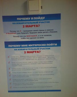 1. Голосование по выбору символа Олимпиады-2014 на входе в избирательный участок 45-21. 2. Незаконная агитационная печатная продукция на избирательном участке, не имеющая выходных данных, с обещанием предоставления товаров и услуг в случае голосования на выборах 2 марта (фото прилагается).
