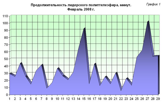 Максимум приходится на самые последние дни избирательной кампании – 27 февраля суммарный лидерский политический эфир составил 102 минуты. Последние пять дней февраля этот показатель не опускался ниже 50 минут за сутки, что превышает не только среднемесячный уровень, но и (за исключением 14 и 15 февраля) не имеет аналогов в течение предшествовавшей большей части месяца).