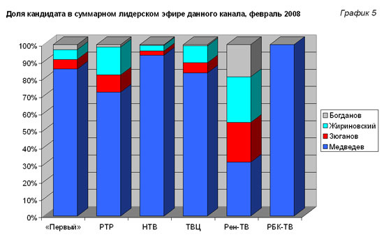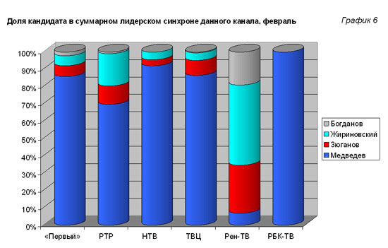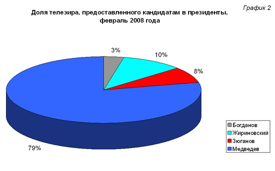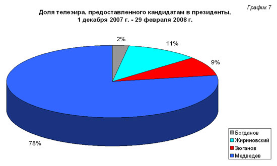 Из них 78,5% было отведено Д.А.Медведеву, 10,4% - В.В.Жириновскому и 3,3% – А.В.Богданову. Г.А.Зюганову досталось 7,8% эфира, или 1 час 19 минут 20 секунд, что в 10,1 раз меньше, чем Д.А.Медведеву и на треть меньше, чем Жириновскому.