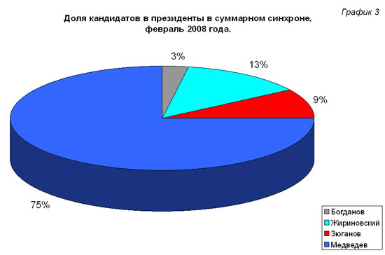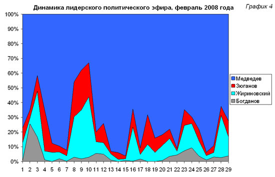 В течение февраля 2008 года на общефедеральных телеканалах в выпусках новостей и информационно-аналитических программах («Новости», «Время» и «Времена» на «Первом», «Вести» и «Парламентский час» на РТР, «Сегодня» и «Реальная политика» на НТВ, «События» на ТВЦ, «Информационная программа 24» и «Неделя» на Рен-ТВ, «Рынки» и «Интрига дня» на РБК ТВ и др.) вышло всего 906 видесюжетов с упоминанием о четырёх кандидатах в президенты, то есть в среднем 31 сообщение в день.