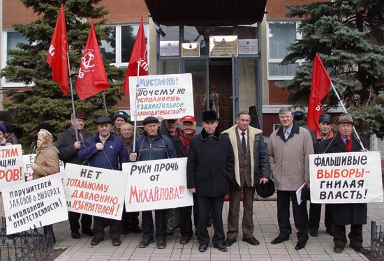 Около 30 коммунистов и их сторонников, в том числе лидеры Саратовского областного, городского и районных отделений КПРФ города С. Н. Афанасьев, Г. А. Турунтаев, В. И. Троилин, П. А. Волошин, И. С. Чумичкин, Б. С. Калимуллин, В. В. Сафьянов с 11.00 до 13.00 пикетировали здание избирательной комиссии Саратовской области. Большинство пикетирующих держали в руках красные флаги КПРФ, а также плакаты и лозунги, отражающие цели и задачи данного пикета, острое недовольство людей официальными итогами только что прошедших выборов: «НЕТ тотальному давлению на избирателей!», «Фальшивые выборы — гнилая власть!», «Фальсификаторов выборов — на нары!», «Мустафин! Почему не исполняешь выборное законодательство?», «Защитим волеизъявление избирателей!», «Руки прочь от Михайлова!»