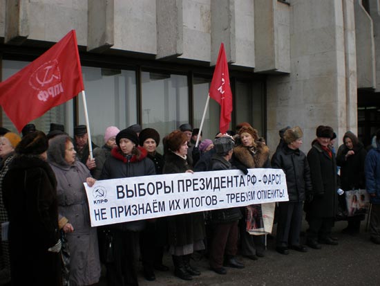 Собравшиеся на митинг заклеймили позором российскую, республиканскую, городскую власти, которые учинили произвол и беззаконие на выборах Президента РФ. Выступающие на митинге рассказали о том, что подведение итогов на выборах происходило с грубым игнорированием Конституции РФ, выборного законодательства, а потому потребовали отменить итоги выборов Президента РФ. Митингующие обратились к председателю ЦК КПРФ Г.Зюганову с просьбой инициировать вопрос об отмене итогов выборов Президента РФ.