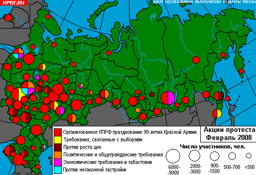 Февраль 2008 года был ознаменован выходом предвыборной президентской гонки на финишную прямую. Кроме того, КПРФ организовала Всероссийскую акцию в честь 90-летия создания Красной Армии и Красного флота. Всего же за последний месяц зимы было зафиксировано 109 митингов, пикетов, сходов и маршей против деятельности антинародного режима почти во всех субъектах федерации. На улицы страны вышло около 76 000 человек