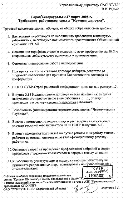 Также горняки требуют отменить запреты на проведение профсоюзных собраний и встреч профсоюза с трудовым коллективом в перерывах между сменами. Дело в том, что, по словам самих шахтеров, на предприятии ОАО «Севуралбокситруда» происходит планомерная дискредитация членов НПГ: запрещается проводить собрания и встречи членов профсоюза, людям запрещают вступать в профсоюз, профсоюзные взносы, которые вычитаются из зарплаты, на счет НПГ не перечисляются.