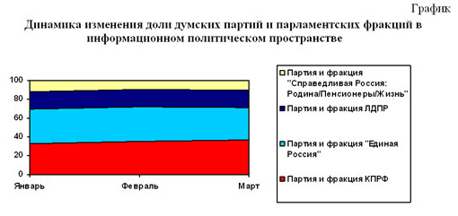 При освещении деятельности думских фракций парламентских партий ситуация была иная: информационно более активной была парламентская фракция «Единой России». В период президентской кампании превосходство фракции «ЕР» над КПРФ было доминирующим от 35-36 пунктов. А в марте думская фракционная активность «ЕР» и КПРФ была практически равной (42,2% у «ЕР» против 40,6 у КПРФ)