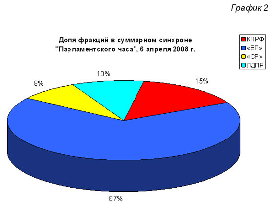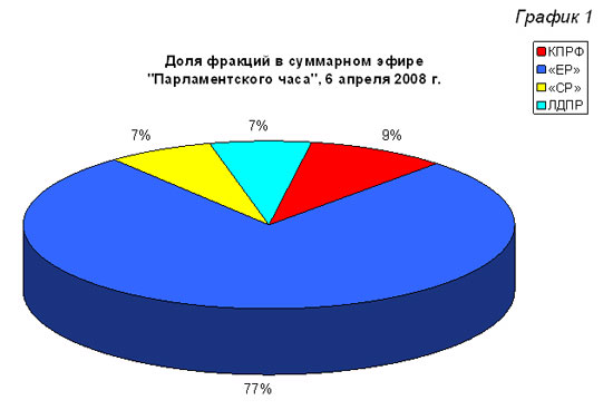 6 апреля 2008 года в передаче «Парламентский час» на телеканале «Россия» фракции КПРФ было посвящено 2 минуты 1 секунда, или 9%. Фракция «Единая Россия» заняла 77% эфира передачи, или 17 мин 5 сек, что в 8,5 раз больше, чем КПРФ.