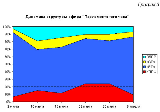 Доля эфира, предоставленного передачей «Парламентский час» каждой из фракций, менялась в течение марта-апреля следующим образом (График 3):
