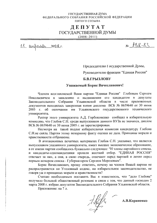 Депутат-коммунист Алексей Корниенко в ходе пленарного заседания Государственной думы РФ 11 апреля выступил с обращением к председателю партии "Единая Россия" Борису Грызлову. Корниенко заявил, что член партии "Единая Россия" Сергей Глебов в ходе выдвижении его кандидатом в депутаты законодательного собрания Ульяновской области в числе приложенных документов предоставил заверенную копию диплома об окончании Ульяновского государственного технического университета. "По сообщению ректора этого университета Глебов среди выпускников данного вуза не значится, номер диплома его не зарегистрирован. Несмотря на такой подлог, избирательная комиссия кандидатуру Глебова не сняла. Партия этому позорному факту оценки не дала", - заявил Корниенко. "От имени партии сообщалось буквально следующее: и члены партийного списка, и кандидаты-одномандатники прошли жесткий отбор. "Единая Россия" отвечает за них, они в свою очередь отвечают перед партией и лично перед первым номером списка губернатором Сергеем Морозовым", - добавил Корниенко.