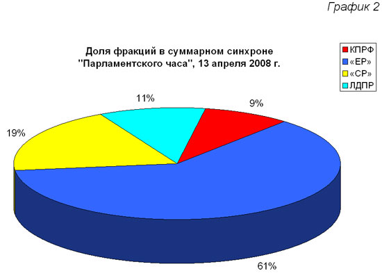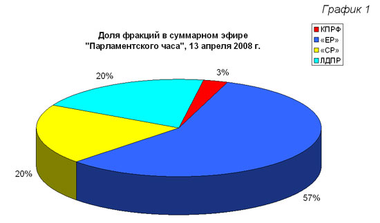 13 апреля 2008 года в передаче «Парламентский час» на телеканале «Россия» фракции КПРФ было посвящено 47 секунд, или 2,8%. Это в 21 раз меньше, чем фракции «Единая Россия» (16 мин 7 сек), и в 7 раз меньше, чем ЛДПР или «СР» (по 5 мин 37 сек). Таким образом, вторая по численности фракция Госдумы получила в «Парламентском часе» эфира в разы меньше, чем все остальные фракции.