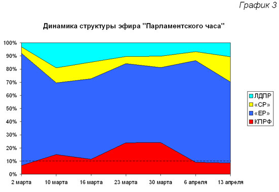 Доля эфира, предоставленного передачей «Парламентский час» каждой из фракций, менялась в течение марта-апреля следующим образом (График 3):