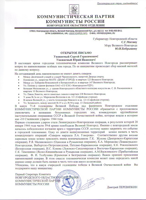 «Мы направили соответствующие открытые письма губернатору области Сергею Герасимовичу Митину и мэру Великого Новгорода Юрию Ивановичу Бобрышеву. Убежден, что в канун очередной годовщины победы в Великой Отечественной войне они поддержат инициативу», — заявил Дмитрий ПЕРЕВЯЗКИН, — «Собственно, важен принцип присвоения наименований скверам. В этом смысле топонимическая комиссия может сама определить какой именно сквер должен быть назван в честь того или иного полководца. Например, территорию между Десятинной улицей и улицей Черняховского логичнее было бы назвать в честь Рокоссовского, так как оба военачальника возглавляли Белорусскую операцию», — отметил руководитель регионального отделения КОММУНИСТИЧЕСКОЙ ПАРТИИ КОММУНИСТЫ РОССИИ.
