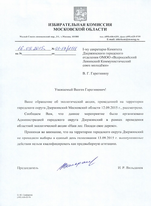 Лидер комсомола города Дзержинский Вазген Гарегинян обратился за разъяснениями к губернатору Подмосковья и в Московскую областную избирательную комиссию. В избиркоме политическую акцию и спекуляции ЕР нарушением решили не считать.