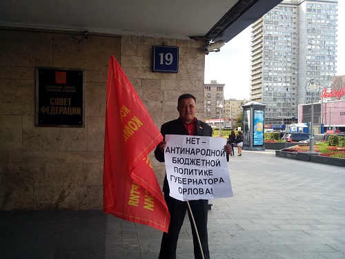 Член ЦК КОМПАРТИИ КОМУНИСТЫ РОССИИ Виктор Перов вышел к зданию Совета Федерации РФ, где расположено представительство с плакатом "Нет антинародной бюджетной политике губернатора Орлова!".
