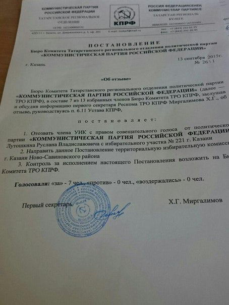 13 сентября 2015 года господин Лутошкин прибыл на избирательный участок в 6:30 утра, а уже в 7 часов 45 минут утра его отозвала из комиссии политическая партия КПРФ (см. фото). Интересен тот факт, что КПРФ в принципе отозвала члена комиссии с правом совещательного голоса из УИК, но еще интереснее, что это решение было принято 13 сентября 2015 года. НАВЕРНОЕ, в 6 утра.