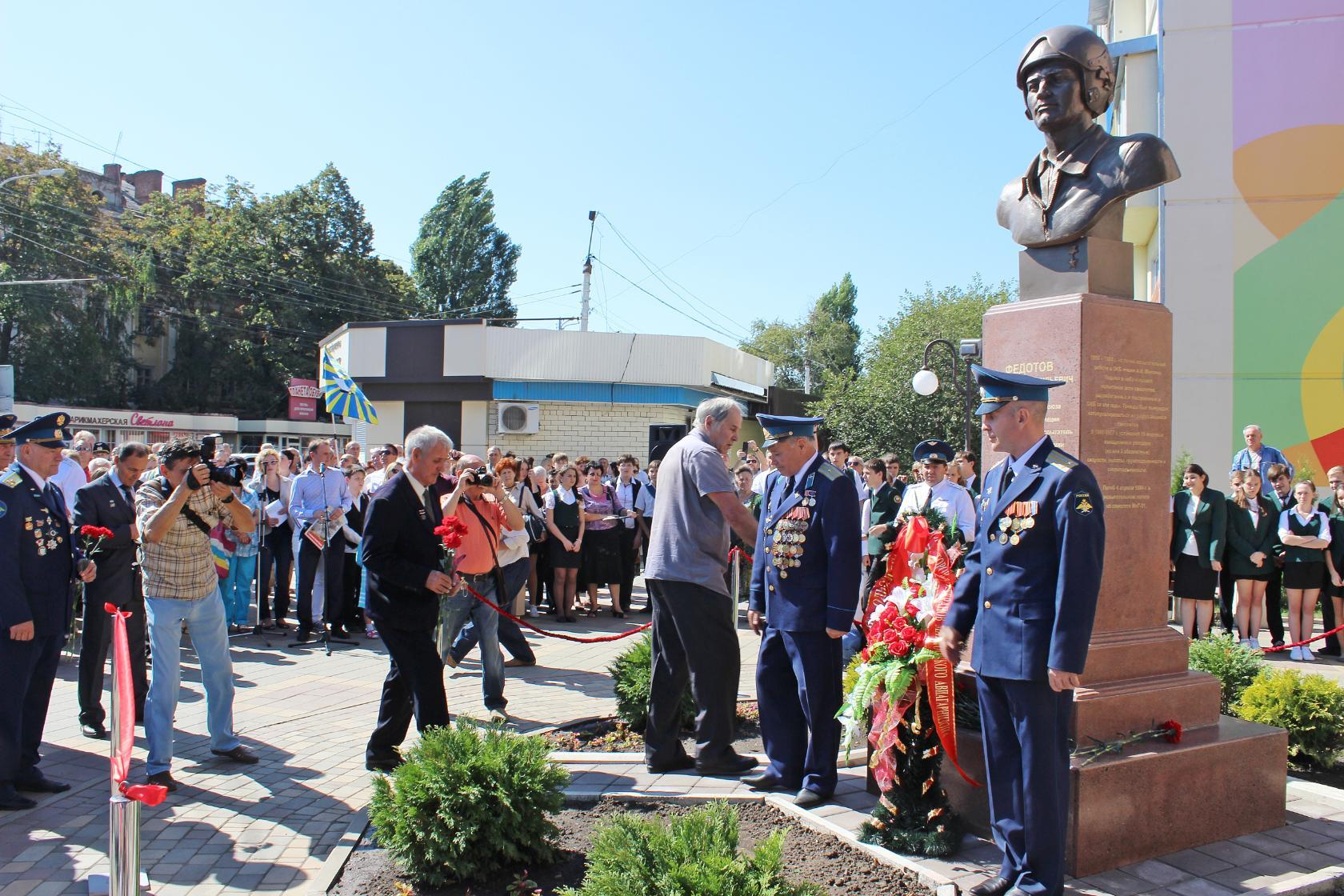 Обращаясь к молодежи, сослуживцам и жителям города Вадим Константинович сказал: «Федотов родился в городе Сталинграде, в 1952 году окончил Армавирское военное летное училище, школу летчиков-испытателей. Был принят в ряды коммунистической партии Советского Союза. Долгие годы работал в ОКБ Микояна. Александр Васильевич поднял в небо и провел испытания всех самолетов созданных в ОКБ. Неоднократно попадал в аварийные ситуации. За годы работы установил 18 мировых авиационных рекордов. За мужество и героизм, проявленные при испытаниях, в 1966 году А.В. Федотову было присвоено звание — Герой Советского Союза.