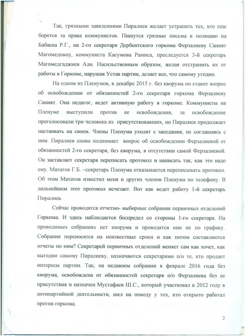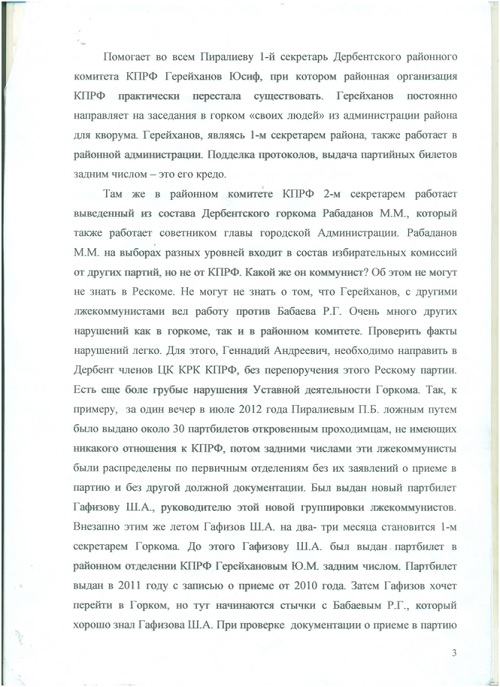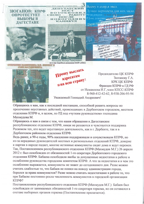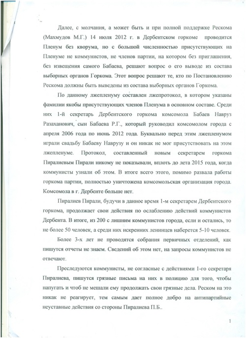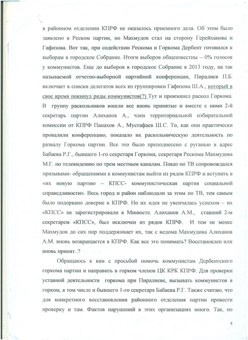 Ïîäîçðåíèå âûçûâàåò òîò ôàêò, ÷òî è ìåòîäû, ÷òî ïðèìåíèëè è â Êàñïèéñêå è â Äåðáåíòå, îäèíàêîâû.  Êàñïèéñêå òîæå íà Ïëåíóì ÃÊ íå áûë íå òîëüêî íå ïðèãëàø¸í, íî äàæå íå èçâåù¸í î Ïëåíóìå Àçèåâ È.È., ñåêðåòàðü ÃÊ è ÷ëåí Ðåñêîìà. Íà òîì Ïëåíóìå Êàñïèéñêîãî ÃÊ ïðèñóòñòâîâàë ñàì 1-é ñåêðåòàðü ÄÐÎ ÊÏÐÔ Ìàõìóäîâ Ì.Ã., êîòîðûé äàæå íå ïîèíòåðåñîâàëñÿ ïî÷åìó íà Ïëåíóìå îòñóòñòâóåò îäèí èç ñåêðåòàðåé ÃÊ è ÷ëåí Ðåñêîìà. Ýòî âûçûâàåò óæå îïðåäåë¸ííûå ïîäîçðåíèÿ â àäðåñ 1-ãî ñåêðåòàðÿ ÄÐÎ. ×åãî äîáèâàåòñÿ Ìàõìóäîâ Ì.Ã.? Óíè÷òîæåíèÿ âñåé ðåñïóáëèêàíñêîé ïàðòîðãàíèçàöèè? Èëè Ìàõìóäîâ Ì.Ã. äîáèâàåòñÿ, ÷òîáû â ïàðòèè íå áûëî íàñòîÿùèõ êîììóíèñòîâ, à áûëè òîëüêî êîììåðñàíòû ïîä âûâåñêîé «Êîììóíèñòè÷åñêàÿ»? Ó÷èòûâàÿ, ÷òî â ïàðòîðãàíèçàöèÿõ ÄÐÎ è ïðåæäå, â ïåðèîä ðóêîâîäñòâà ÄÐÎ Ìàõìóäîâûì, áûëè íåñêîëüêî «êðèçèñîâ», òî äàãåñòàíñêèì êîììóíèñòàì, åñëè îñòàëèñü â Äàãåñòàíå íàñòîÿùèå êîììóíèñòû, ïîðà ñåðü¸çíî è çàèíòåðåñîâàííî ïðîàíàëèçèðîâàòü äåÿòåëüíîñòü Ìàõìóäîâà Ì.Ã. íà ïîñòó 1-ãî ñåêðåòàðÿ ÄÐÎ, ïîêà åù¸ íå ïîçäíî. Ïî ñâåäåíèÿì, ïîëó÷àåìûì îò äðóçåé è çíàêîìûõ, íàðûâàåò íàðûâ è â äðóãèõ ÌÎ ÊÏÐÔ. Ñàìà ðåñïóáëèêàíñêàÿ ïàðòèéíàÿ îðãàíèçàöèÿ ÊÏÐÔ, óæå ðèñêóåò ïðåêðàòèòü ñâî¸ ñóùåñòâîâàíèå. Òîãäà îïÿòü êòî-òî íà÷í¸ò èñêàòü îáúÿñíåíèÿ è îïðàâäàíèÿ . Áóäåò ïîçîð ïî âñåé ñòðàíå".