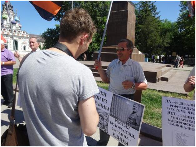 "Мы, члены политических партий: Коммунисты России, Саратовского городского Союза Советских офицеров вышли на пикет, чтобы выразить солидарность с борьбой жителей Юго-Восточных областей Украины за право жить в мире, говорить на родном языке, против фашистско-бандеровкой Хунты, засевшей в Киеве. Мы поддерживаем курс Президента России на проведение независимой от США международной политики, отстаивающей интересы России, стремящегося мирного урегулирования Украинского вопроса.