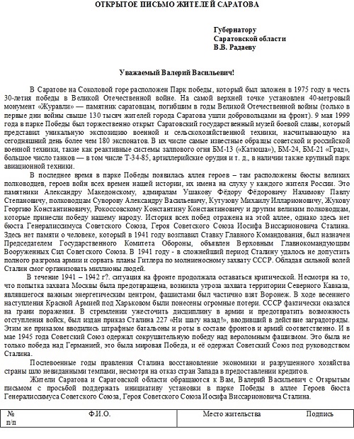 Саратовцы охотно подписывались под обращением к Губернатору Саратовской области, выражая полное согласие в том, что имя Сталина достойно увековечивания.