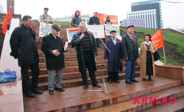 В Казани у памятника Муллануру Вахитову участие в митинге пришли 250 казанцев с красными флагами, воздушными шарами, плакатами: «Капитализм банкрот! Даёшь социализм!», «Социализм это общество народовластия социальной справедливости и равенства», «Нет планам растления, развращения, ограбления, уничтожения России!!!», «США – империя зла и лжи».