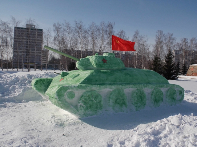 В парке Победы состоялся митинг коммунистов. Красные знамена и транспаранты появились только под конец праздничного мероприятия. Из-за морозов сломалась машина, на которой и должны были доставить атрибутику. Зато собравшиеся приятно удивились, увидев на постаменте снежный танк Т-34. - Сделали его в натуральную величину, - рассказывают умельцы из партии КОММУНИСТЫ РОССИИ. – Несколько человек трудились четыре дня. Использовали только снег и краску. Даже водой не заливали, морозы помогли. Полиция сразу заинтересовалась нашим творчеством, но не мешала. В конце концов, на каком основании нам могли запретить лепить снег? Жаль, конечно, что весной растает, но мы всем даем понять, что именно этот советский символ должен стоять в Парке Победы в качестве памятника. Большую часть митинга ораторы говорили о величии советской армии и критиковали нынешних военачальников: «Сейчас войска находятся в таком плачевном состоянии, что вряд ли смогут дать отпор НАТО. События на Украине хорошо показали, что с Россией мало кто считается». В принятой резолюции митинга челнинские коммунисты потребовали приговорить бывшего министра обороны РФ Сердюкова и его помощников к высшей мере наказания: «Необходимо оснастить армию современным отечественным оружием, повысить авторитет военной службы! Требуем прекратить закупки иностранной военной техники и снаряжения! НАТО, ЕС, США - руки прочь от суверенитета Украины! Властям России извлечь урок из трагических событий на Украине и не допустить подобного в нашей стране!» Помимо армейских тем, в резолюции были и другие требования: «Закрыть развратный телеканал «Пятница», «отменить грабительский тариф на тепло», «убрать незаконный платеж за ТО газовой плиты», «построить школы в 35, 36, 37 комплексах», «установить пешеходные переходы и дорожные знаки на улице Раскольникова в 35 комплексе», «обеспечить выполнение обязательств ЗАО «ФОН» перед дольщиками 65 микрорайона». «Заявляем городским властям, что город этой зимой был превращен в каток! Горожане каждый день подвергают свою жизнь и здоровье опасности! Требуем очистить от снега и льда проспекты, внутрикомплексные дороги, тротуары. Посыпать песком и реагентами!», – говорится в обращении.