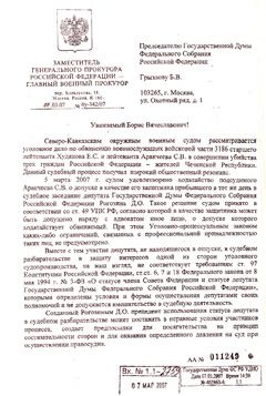 Сегодня возобновились слушания по делу русских офицеров Сергея Аракчеева и Евгения Худякова, обвиняемых в убийстве чеченцев. В намерен выступить депутат Госдумы, руководитель общественного движения "Родина. Конгресс русских общин" Дмитрий Рогозин. Сегодня же стало известно, что в ход процесса вмешался главный военный прокурор РФ, генерал-полковник юстиции Сергей Фридинский. 7 марта он направил на имя спикера Госдумы письмо, в котором говорит о недопустимости участия Дмитрия Рогоизна в процессе. "Созданный Рогозиным Д.О. прецедент использования статуса депутата в судебном разбирательстве может поставить в неравные условия участников процесса, создает предпосылки для посягательства на принцип состязательности сторон и для оказания определенного давления на суд при осуществлении правосудия", - говорится в письме Фридинского.
