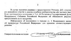 Фридинский также настаивает, что как депутат, не находящийся в отпуске, Дмитрий Рогозин не может принимать участия в судебной деятельности. Но даже в случае ухода в отпуск главный военный прокурор отказывается признавать право Рогозина на участие в процессе по делу Аракчеева-Худякова, так как это противоречило бы обязанностям депутата присутствовать на заседаниях Госдумы. Заметим, что 12 марта Дмитрий Рогозин официально оформил свой уход в отпуск.