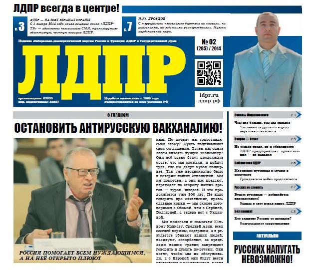 Лидер партии Владимир Жириновский в своей статье «Остановить антирусскую вакханалию» (стр.1) утверждает, что Россия не должна оказывать поддержку другим странам, иначе ее саму ждет бесславное будущее. «Запад пытается провернуть свои планы по разрушению России чужими руками», - пишет политик. По его словам, Европа с Америкой не начнут войну против нас, но будут «постоянно провоцировать через наши национальные окраины и отовсюду выдавливать. Это произошло уже на Ближнем Востоке, Балканах, в Грузии. Теперь – на Украине. Мы им помогаем, а они нас предают». Выход один – «оставить деньги себе, развивать свои возможности. Тогда украинская молодежь поедет к нам и будет говорить: «Мы хотим, как в Москве», - объясняет автор.
