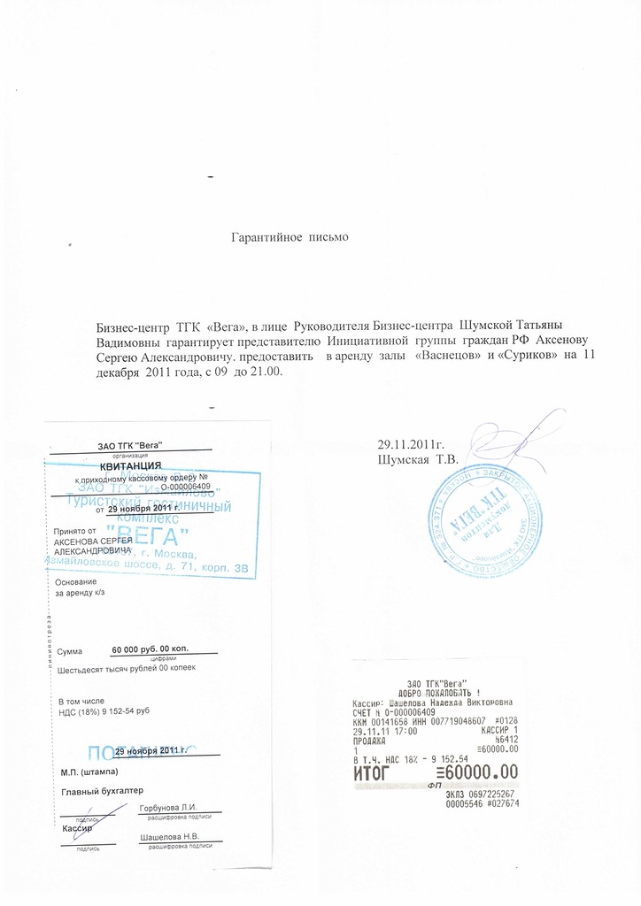 29 ноября. Арендую у ТГК «Вега» (гостиница «Измайлово») зал для выдвижения Лимонова на 11 декабря. Составляем соответствующее гарантийное письмо, оплачиваем зал (скан документов ниже).