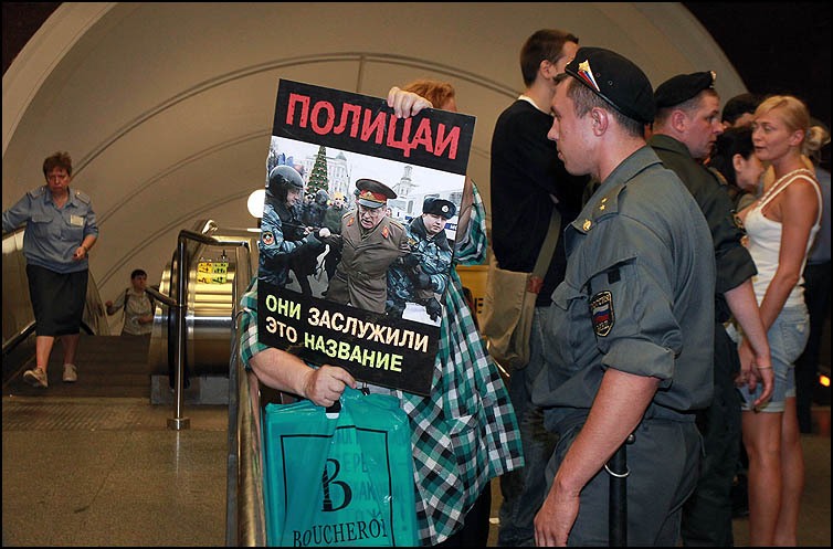 Чудом не попав под «замес», устроенный полицией на поверхности я спустился вестибюль метро Маяковская. Собственно идти больше было некуда все проходы по улице были перекрыты и единственный выход с площади был через метро, куда с радостью сотрудники правонарушительных органов заталкивали людей. В вестибюле спускающихся людей встречали подчиненные начальника 2-го отдела милиции на метрополитене полковника Чернышова В.В. и препровождали к турникетам. Проходить через турникет я отказался, сославшись на отсутствие у меня денег и билета и сообщив сотруднице, что я хочу пойти пешком. Не хочу врать у меня были деньги на проезд, но сам факт принудительного проезда в метро заставил меня дать такое объяснение. Тем более мне действительно не надо было никуда ехать. Ситуацию разрядил кто-то из моих знакомых, предложив пройти через турникет за ним. Остановившись с другой стороны турникета я стал ждать своих друзей спускавшихся вниз.
