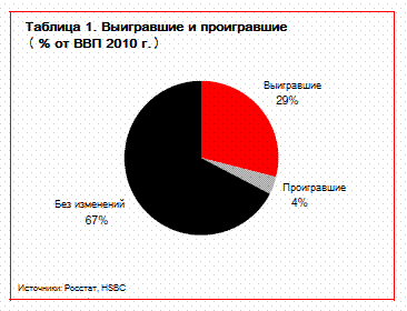 Важно, что доля так называемых "выигравших" отраслей в значительной степени превышает долю "проигравших" в номинальном ВВП России и составляет по приблизительным подсчетам примерно однутреть ВВП России. Доля "проигравших" – порядка 4% ВВП, при этом членство в ВТО не окажет какого-либо существенного влияния примерно на дветрети экономики России. Стоит отметить, что отрасли, которые останутся в выигрыше, не только составляют значительную часть ВВП России, но и вносят существенный вклад в его рост.