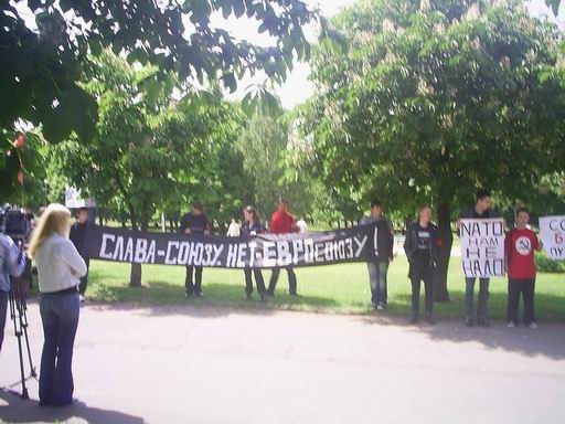 Национал-большевики Минска выстроившись в ряд и развернув растяжку «Слава Союзу, нет Евросоюзу», а также плакаты следующего содержания: «Долой блокаду Приднестровья!», «Стоп НАТО!», «Мы требуем признать независимость Приднестровья, Абхазии, Южной Осетии!». Начали скандировать лозунги в поддержку непризнанных республик, а также против НАТО и Евросоюза, естественно вниманием не была обделена белорусская коллаборационистская оппозиция, представители которой митинговали неподалеку.