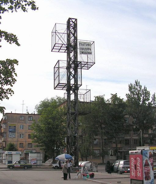 Сегодня, в день независимости России неизвестно от кого (может от Грузии?), в городе Пскове неизвесные вывесили плакат: "Путин - палач свободы"