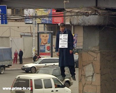 Естественно, этот вопрос НБП без внимания оставить никак не могло. В итоге 19 сентября совместными с СКМ усилиями в Красноярске был проведен пикет против очередного бзика властей. Прошло мероприятие, как почти и всегда, весело и наглядно. Местом действа был выбран оживленный пятачок на Театральной площади, возле транзитных остановок между правым и левым берегами Красноярска. Над дорогой еще пешеходный мост есть. Вот там за 2 часа до объявленного времени пикета взорам прохожих предстала жертва новой реформы – повешенный, с табличкой – «Нету денег на образование, студент Вова». Народ начал волноваться, мгновенно примчались журналисты и милиция. «Повешенный» же начал бодро махать рукой прохожим и хаять надвигающуюся реформу. Им оказался наш старый добрый знакомый – коммунист Рим Шайгалимов. Снять его оттуда сотрудники милиции смогли лишь через полчаса, когда журналисты вдоволь наснимались, а тысячи прохожих и пассажиров маршруток прошли и проехали мимо. Ажиотаж был просто чумовой. Ну а путь с таких акций у Рима Каримовича традиционный – в ЦРОВД.