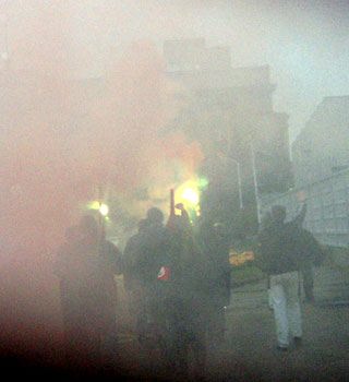 По окончании митинга было заявлено факельное шествие, но администрация его запретила, нарушив закон «О митингах…». Тут маленько сглупили мы, когда чуть в стороне от митинга начали заливать в факела масло, надо это было делать в толпе. Подлетевшие менты факелы отняли и закинули в багажник машины. Причем протоколов изъятия не оформлялось, таким образом сотрудниками МВД было совершено открытое хищение чужого имущества! Будем требовать в прокуратуре возбуждения уголовного дела.