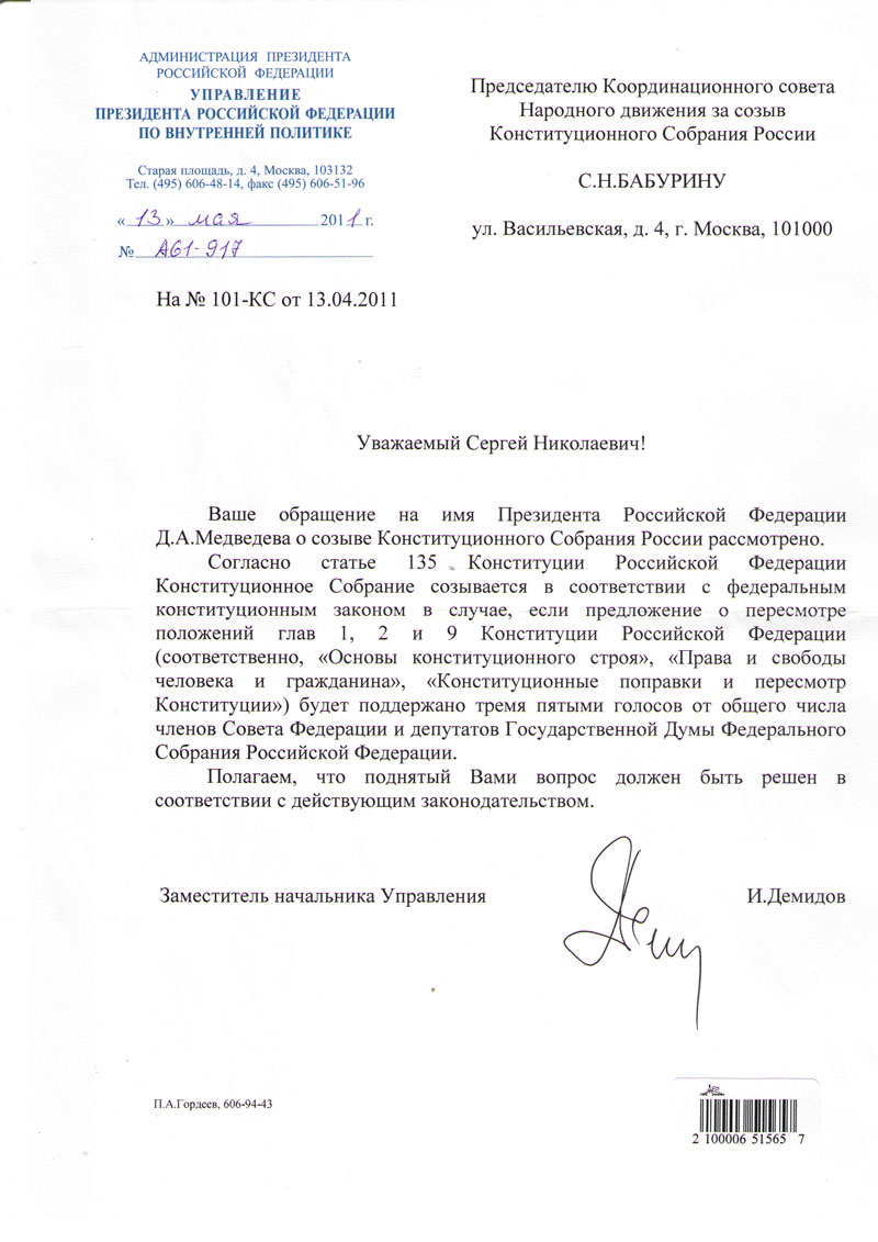 Ответ Администрации Президента РФ на обращение на имя Президента РФ о созыве Конституционного Собрания России