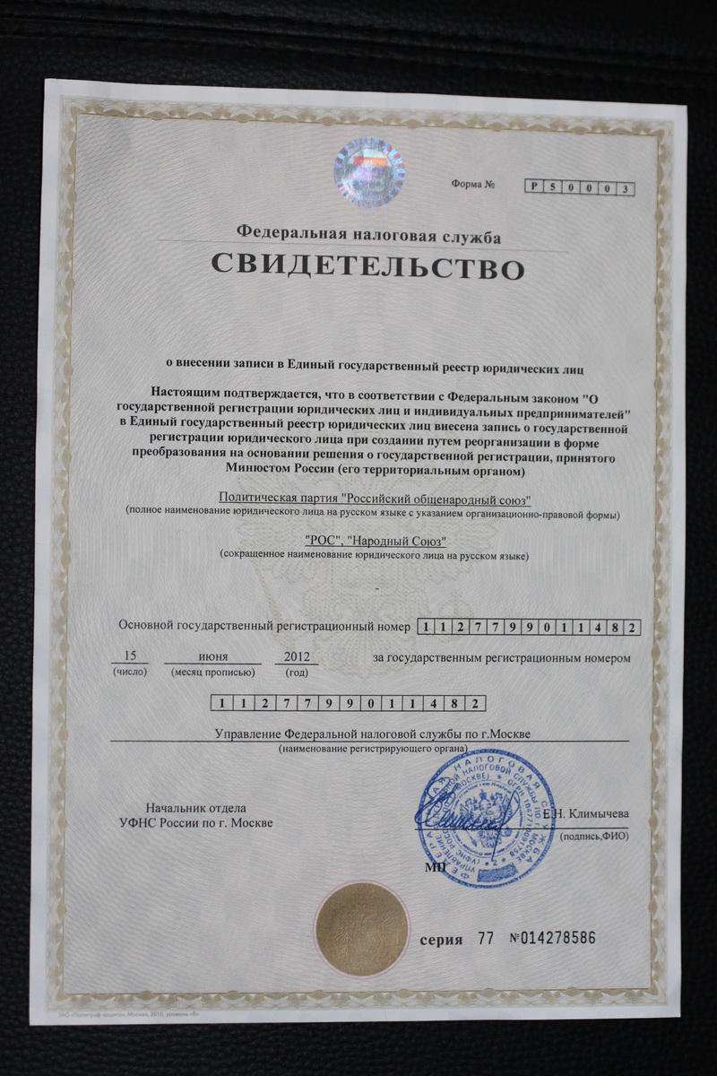 15 июня 2012 года Министерством юстиции РФ зарегистрирована политическая партия «Российский общенародный союз» (ОГРН 1127799011482 от 15.06.2012).