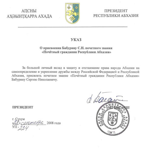 Председателю Народного Союза Сергею Николаевичу Бабурину присвоено звание почётного гражданина Абхазии