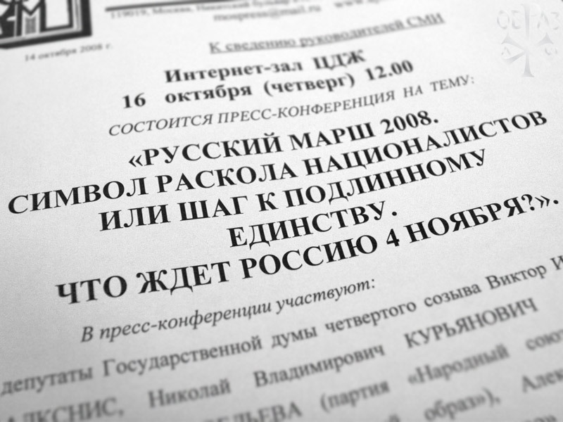В минувший четверг, 16 октября в Доме журналистов состоялась пресс-конференция оргкомитета «Русского марша — 2008», в которой приняли участие лидеры партии «Народный Союз», депутаты Государственной Думы четвёртого созыва Виктор Имантович Алкснис, Николай Владимирович Курьянович и Ирина Валентиновна Савельева, координатор движения «Русский образ» Дмитрий Тараторкин и координатор Русского гражданского общества Алексей Михайлов.