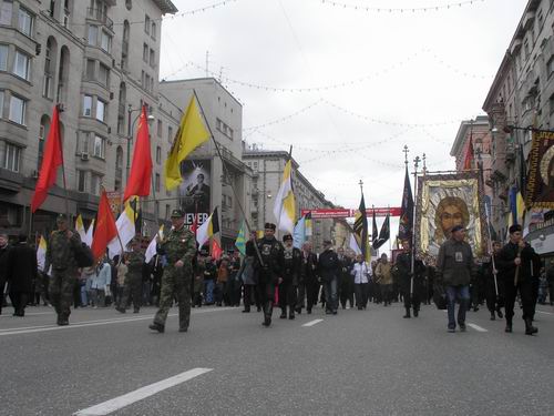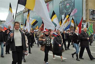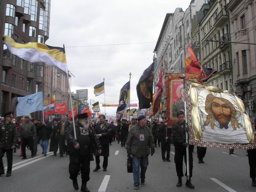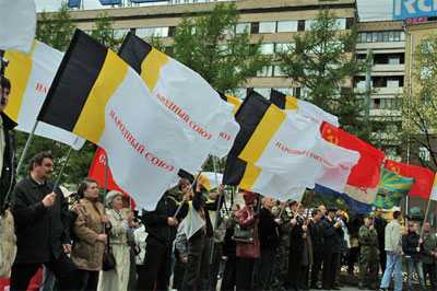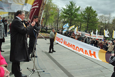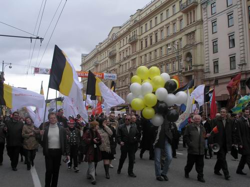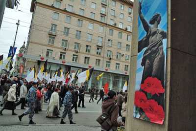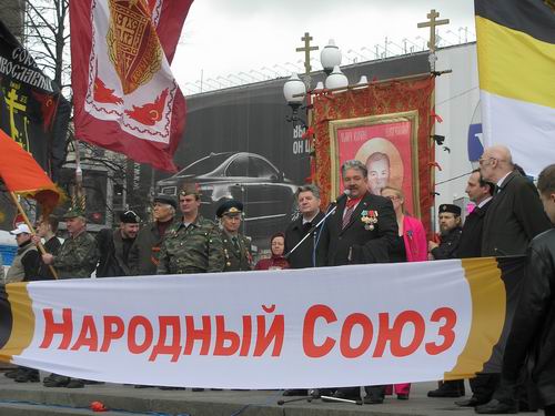 9 мая к 12 часом на площадь Тверской заставы возле Белорусского вокзала собралисьчлены Народного Союза и вошедшие в него общественные организации - «Союз офицеров», «Русский общенациональный союз», «Союз Православных Хоругвеносцев», «Славянский Союз», движение «Женщины во власть» и другие. Построившись в колонну и развернув знамена и хоругви, собравшиеся двинулись к месту проведения митинга в Новопушкинском сквере. По пути следования демонстранты выкрикивали лозунги: «Слава России», «Русские вперед», «Слава русскому оружию», «Слава народу-победителю!».