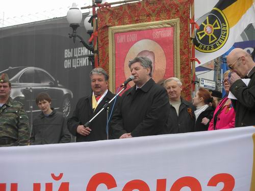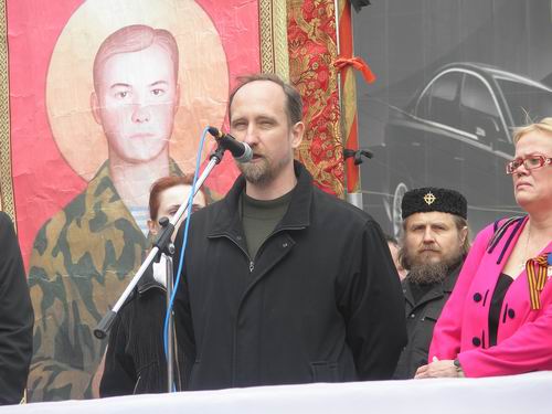 Уважаемые друзья! Соратники! Сегодня Народный Союз впервые под своими знамёнами, под своим именем вышел на улицы Москвы. И это символично, что первая наша публичная акция проходит после получения 7 мая официального свидетельства о регистрации партии в Министерстве юстиции в главный праздник нашего народа в День Победы. В День Победы огромной страны, Советского Союза, не просто над фашистской Германией, а над объединённой гитлеровцами Европой.