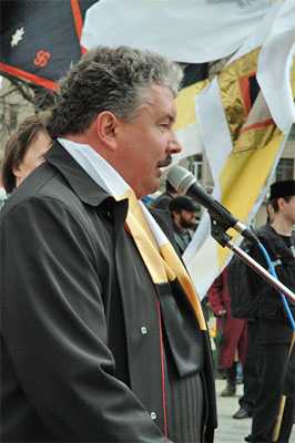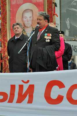 Сегодня здесь не только флаги Народного Союза. Здесь, прежде всего знамя Победы, то знамя, которое было водружено над гитлеровским рейхстагом. То знамя, которое мы никогда не дадим осквернить ни «Единой России», ни кому бы то ни было. Его нельзя фальсифицировать. Именно по ним, под красным полотнищем с серпом и молотом и с золотой красной звездой наши предки одержали историческую победу.