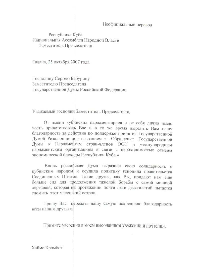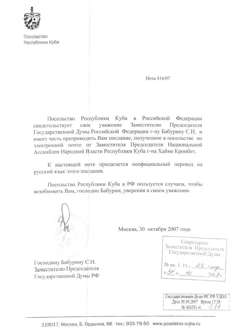 Посольство Кубы - С.Н. Бабурину: благодарность за поддержку