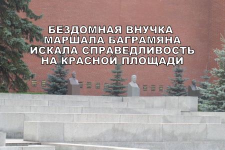 Полиция задержала на Красной площади Гаянэ Амрахову - внучку маршала СССР Ивана Баграмяна - за то, что она приковалась наручниками к ограде напротив места захоронения военачальника у кремлевской стены. К такому жесту отчаяния женщина прибегла после того, как лишилась своего единственного жилья.
