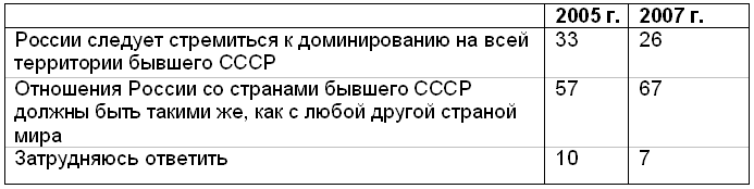 Примечательно, что в 2000-2007 годы достаточно радикально менялись представления россиян и по другим вопросам. Так, менялись, например, и представления граждан России относительно политики по отношению к бывшим республикам СССР. "Имперское" сознание становилось все более прагматичным, а альтруизм сменился вполне рыночным подходом. Эта эволюция стала особенно заметной на примере взаимоотношений с Украиной, Грузией, Эстонией. Можно даже говорить о новом изоляционизме, когда Россия все больше концентрируется на внутренних проблемах. На самом деле, как мне кажется, речь идет не о национализме или изоляционизме, а о самоконцентрации.