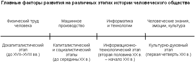 Понятно, что "в чистом" виде ни одного из этапов не существует. Даже на информационно-технологическом этапе развития, на котором сегодня находится часть общества и экономики России, значительный объем с/х продукции производится, в т.ч. и на приусадебных участках. Однако если говорить о преимущественных укладах и факторах, влияющих на их развитие, о пропорциях, то мы увидим вполне определенную тенденцию "одушевления", "окультуривания", "очеловечивания" производства. Как, впрочем, и общественно-политической и государственной жизни.