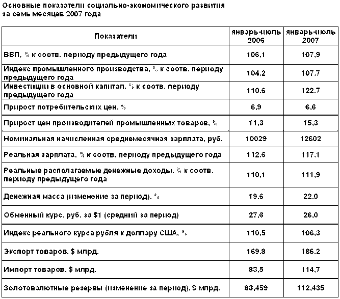 Во многом это происходит из-за того, что главные (и, по сути дела, на сегодня единственные) показатели развития экономики не имеют ничего общего с оценкой развития человеческого потенциала. За исключением зарплат и доходов, все они относятся к макроэкономическим показателям. Так, по итогам развития России за первое полугодие 2007 года ситуация выглядела следующим образом.